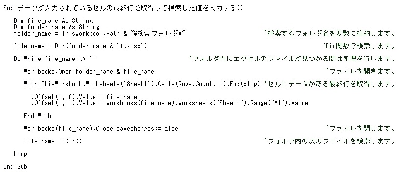 Do While file_name <> "" 'フォルダ内にエクセルのファイルが見つかる間は処理を行います。