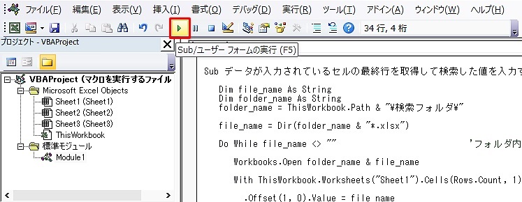マクロを実行するファイル.xlsmのVBEの標準モジュールのコードを表示し「Sub/ユーザーフォームの実行」ボタンを押して標準モジュールのプログラムを実行します。