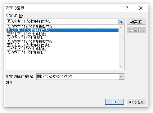 マクロ名から「図形を右に1ピクセル移動する」を選択し「OK」ボタンを押してマクロを登録をします。