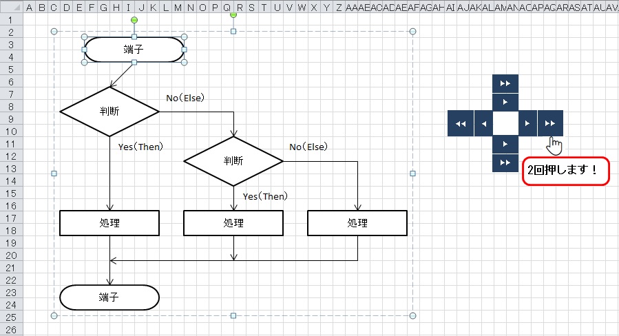 Excelでフローチャートを作成して図形の位置を微調整したいときは、図形を選択して「矢印」キー(↑↓ ← →)、またはより細かく調整したいときは「Ctrl」キー +「矢印」キーを使って行います。