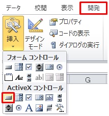 「開発」タブ →「挿入」→「コマンド ボタン (ActiveX コントロール)」をクリックします。