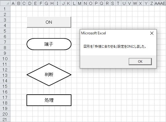 ボタンの表示が変わることでセルの「枠線に合わせる」設定の状態が見てわかるようになりフローチャートで図形を操作する作業が少し楽になったかと思います。