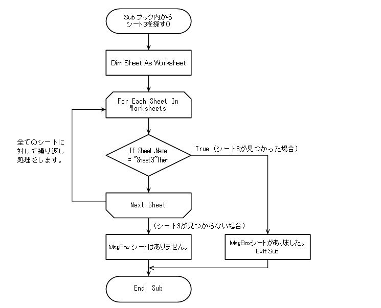 「Sheet3」が見つからなかったときは「シートはありません。」とメッセージを表示しますが、これを「For Each…Next」の後で行うのがこのプログラムのポイントになります。
