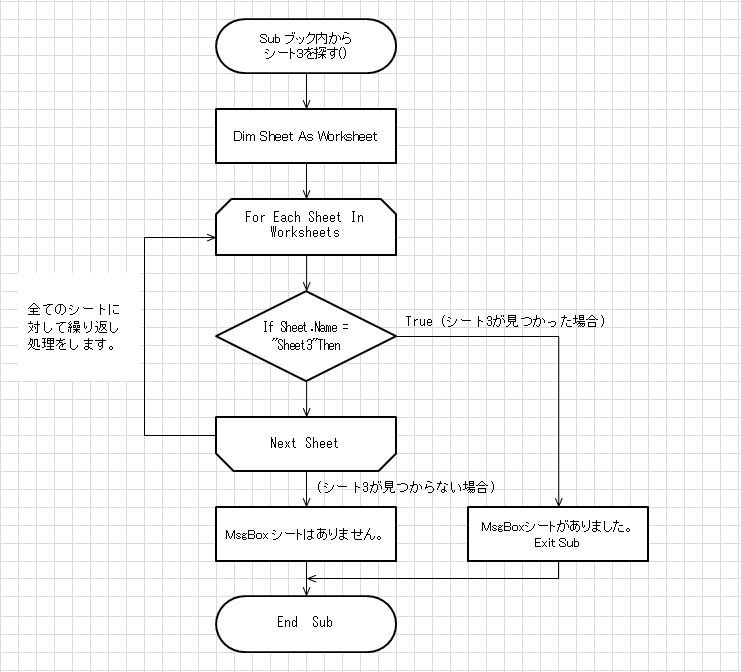 「For Each…Next」は同じ処理を繰り返し行いたいときによく使われ、このプログラムではブック内の全てのシートに対して一つずつ順番にシート名が「Sheet3」であるか確認をして、見つかった場合は「シートがありました。」とメッセージを表示してからプログラムを終了するようにしています。