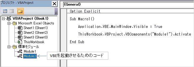 また、前回と同様にVBEの編集画面を表示させるためのコードを別のモジュール(Module2など)に分けておけば、画面には修正対象のプログラムだけが表示されて作業者がメンテナンスに集中しやすくなるはずです。